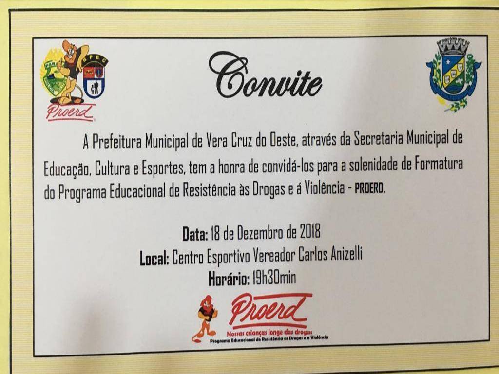 No dia 18 de dezembro de 2018, nas dependências do salão social do centro esportivo Carlos Anizelli, os alunos dos 5° anos da rede municipal de ensino de Vera Cruz do Oeste, se formaram no programa PROERD.